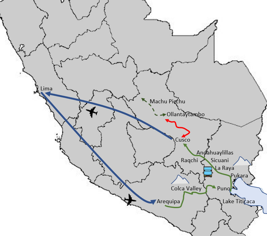 Travel Itinerary: Lima city →Arequipa city → The Colca Valley →The Lake Titicaca → The Route of the sun Puno to Cusco → Cusco city → Machu Picchu inca citadel