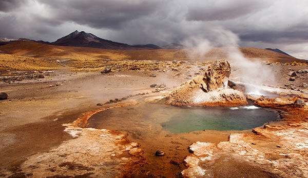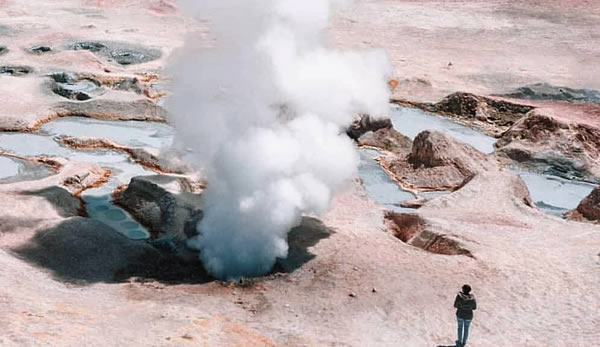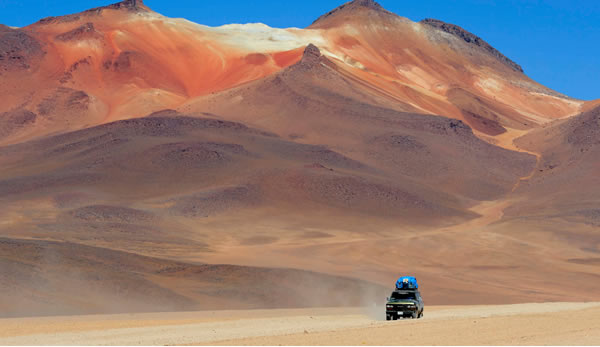 Atulcha - Lagunas - Laguna Colorada - Geysers - Hot Springs - Polques : We awake early and have breakfast before leaving to travel further south. You will first have the chance to visit the Sora Canyon and see llamas in their natural environment before continuing through the Chuguana desert area where the scenery will include a number of extinct volcanoes plus the semiactive Ollague. As the journey continues we will pass by high altitude lagoons that are home to 3 species of flamingo before arriving intothe desert of Siloli and the “tree of rock”. We then move onto the “Laguna Colorada”, an amazing red colored lake full of flamingos. Here is where we enter the Eduardo Avaroa National Park. In late afternoon we then go to visit the “Sol de Mañana” geysers and see the bubbling mud pools and steam jets. We will then continue to Polques where we find the hostel where we will spend the night. After dinner, you can decide to relax in the warm water pools of the local hot springs while enjoying the breathtaking starry sky.